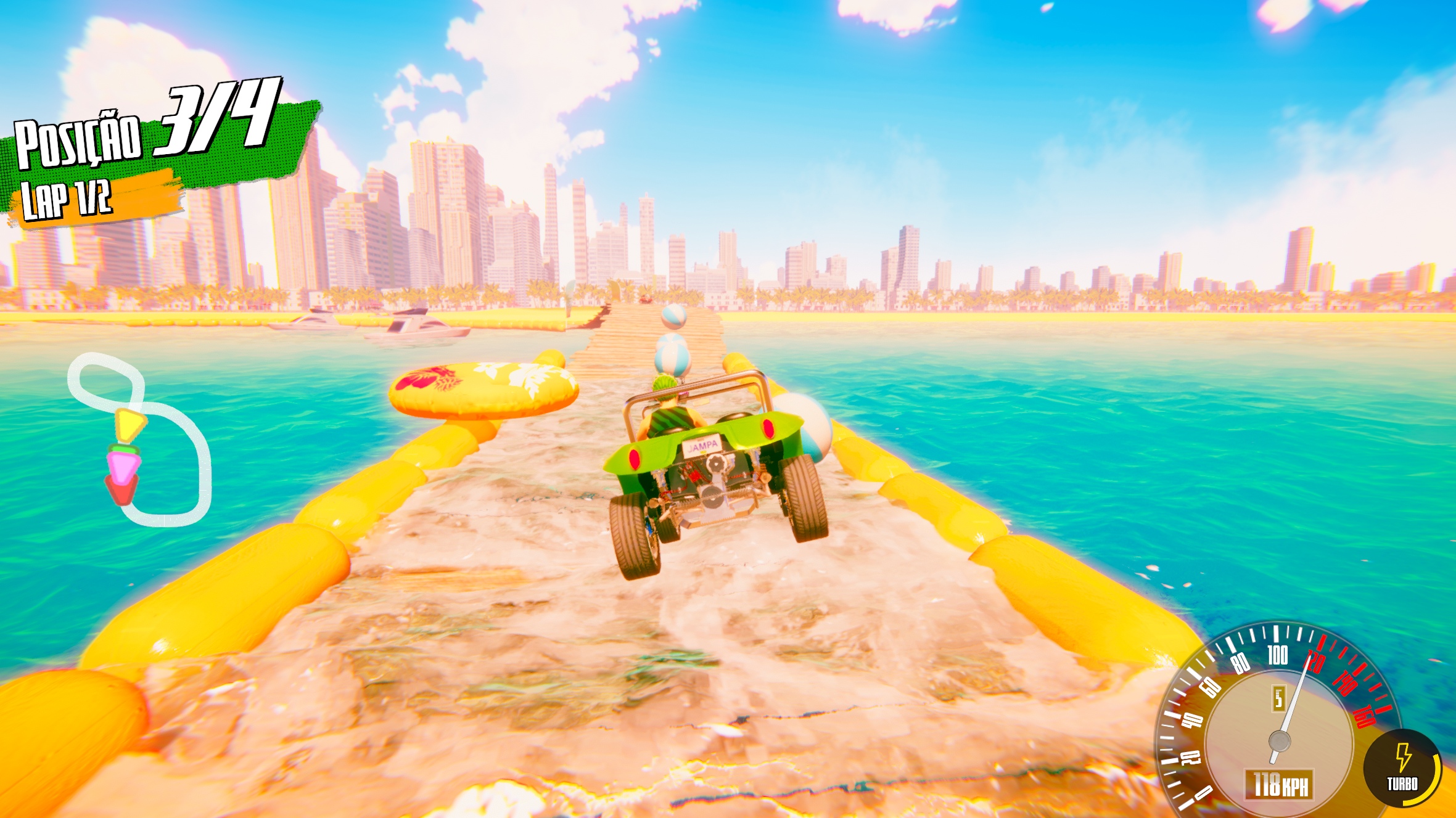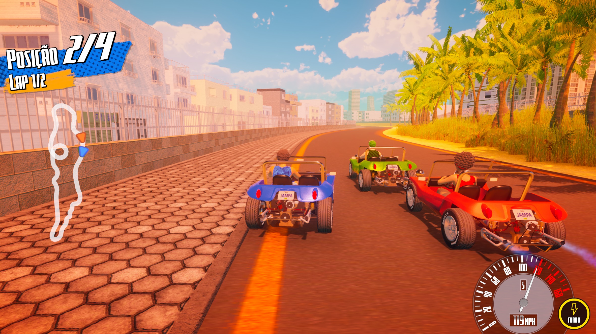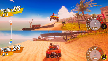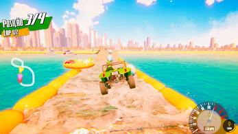 The tracks in Jampa Buggys are inspired by the coastline of João Pessoa, featuring sunny beaches, colorful cliffs, urban areas, and trails through the Atlantic Forest.